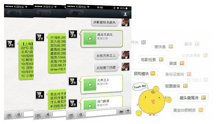 微信企業(yè)應(yīng)用與電子商務(wù)有小黃雞陪聊加強(qiáng)版。510萬數(shù)據(jù),過濾了廣告和一些敏感詞匯。 還有天氣查詢 ,手機(jī)查詢,郵編查詢,快遞查詢(支持160家快遞公司),身份證查詢,人品計(jì)算,翻譯字典,百科(全網(wǎng)數(shù)據(jù)),音樂80.1萬 ,笑話5萬條,小黃雞陪聊510萬條,詩詞23萬首,詩句 225萬,成語5萬謎語5萬,解夢3萬,糗事55萬,公交線路4萬,火車線路4500,機(jī)器人學(xué)習(xí)功能等等......